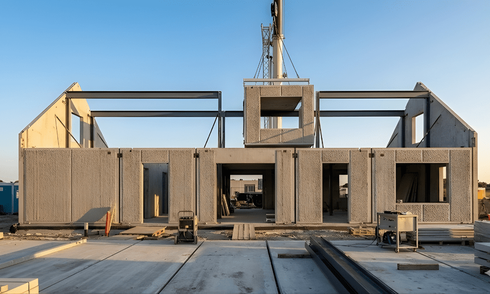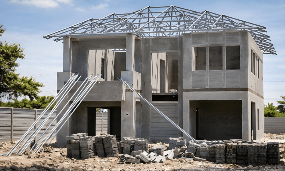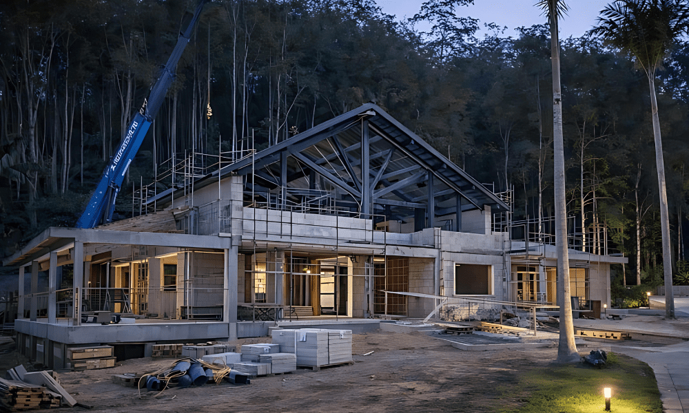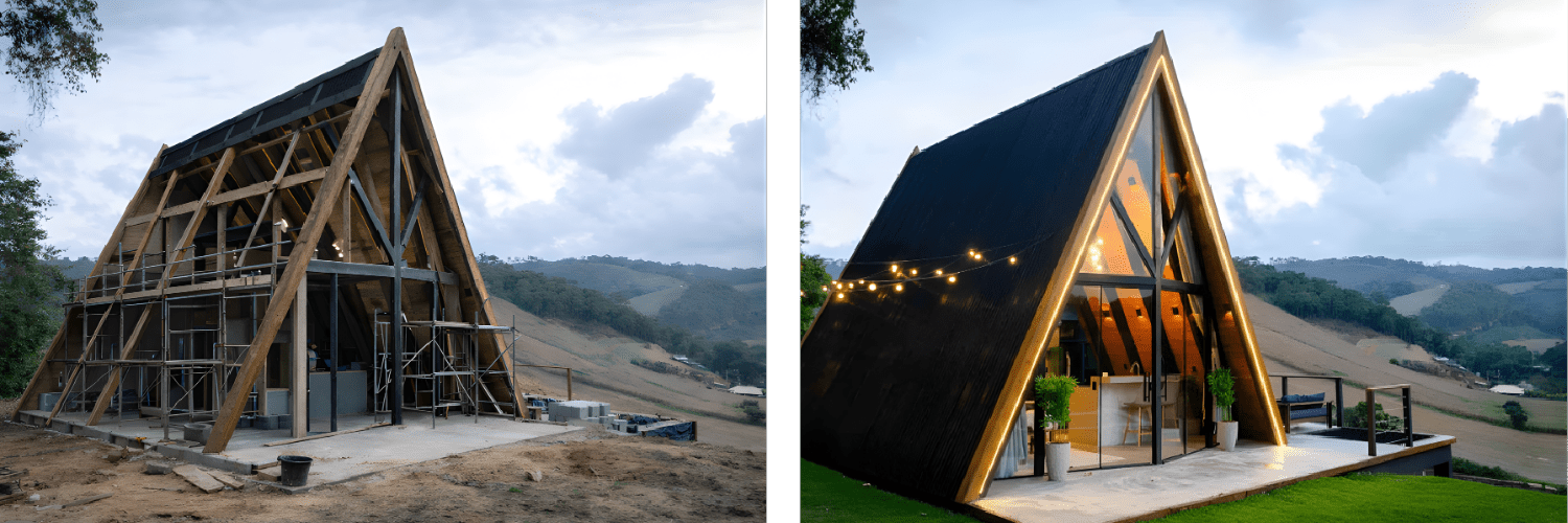 A Construção Contempla estrutura de steel frame integrada com fechamento em placa cimentícia, janelas e portas planejadas conforme projeto arquitetônico, considerando desempenho, eficiência e qualidade final.