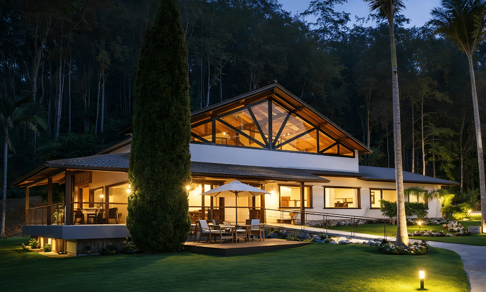 Desenvolvimento de chalé residencial adaptado a terrreno com relevo e clima específicos, com foco em conforto térmico, integração com entorno e soluções construtivas adequadas.